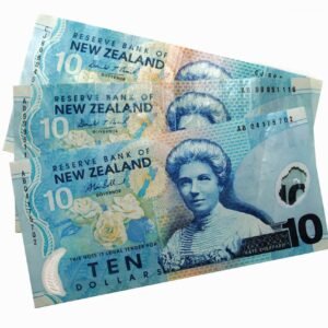 The $10 New Zealand bill is 6.3 x 3.0 inches, predominantly blue with green and yellow accents. It features a portrait of Kate Sheppard on the front and the suffrage memorial on the back.